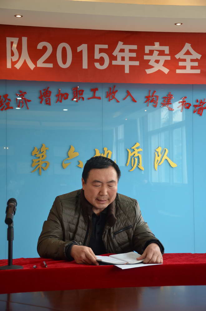 會議四項內容:一是隊長王根寶傳達學習了地礦總公司2015年安全生產與治安保衛工作會議精神;二是主管安全生產工作的黨委書記、副隊長王戰社總結了2014年我隊安全生產與治安保衛工作情況,并對2015年安全生產與治安保衛工作進行了部署;三是隊長王根寶通報了2014年度安全生產與治安保衛責任考核結果,并進行了兌現獎勵;四是與11個實體或部門簽訂了2015年安全生產與治安保衛工作責任書。