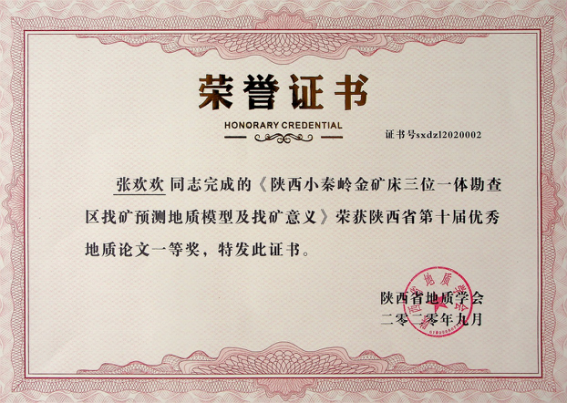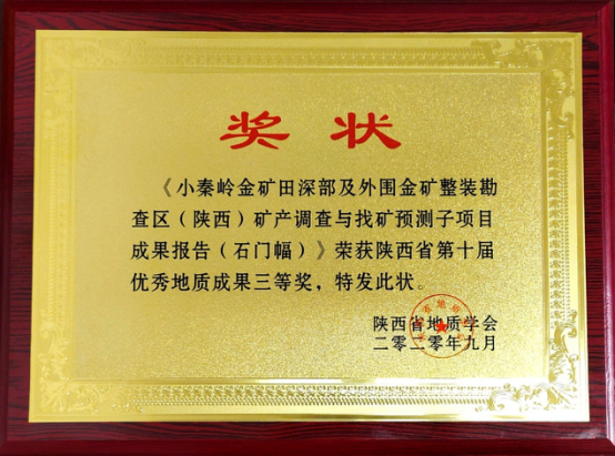 由我公司地調所編制完成的“小秦嶺金礦田深部及外圍金礦整裝勘查區(陜西)礦產調查找礦預測子項目(石門幅)成果報告”獲陜西省第十屆優秀地質成果三等獎;張歡歡同志撰寫的“陜西小秦嶺金礦床三位一體勘查區找礦預測地質模型及找礦意義”獲優秀地質論文一等獎;李長壽同志撰寫的“陜西小秦嶺金礦田石英脈型金礦床石英熱釋光特征及其找礦意義”獲優秀地質論文三等獎。